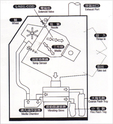 以液態氮(冷媒)將工作物冷凍,工作物在冷凍的過程中會變硬及變脆,然後再用塑膠砂材高速碰撞,即可完成去除毛邊。